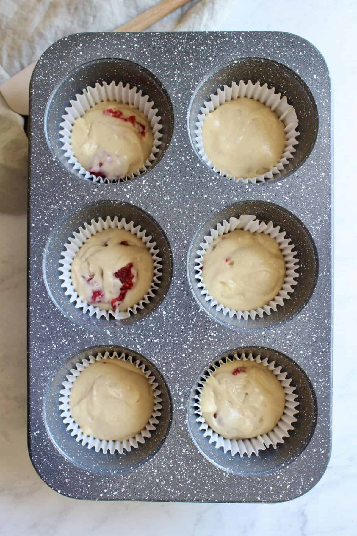 Carefully fold in chopped white chocolate and raspberries to avoid breaking the fruit. Scoop the batter carefully into prepared molds.